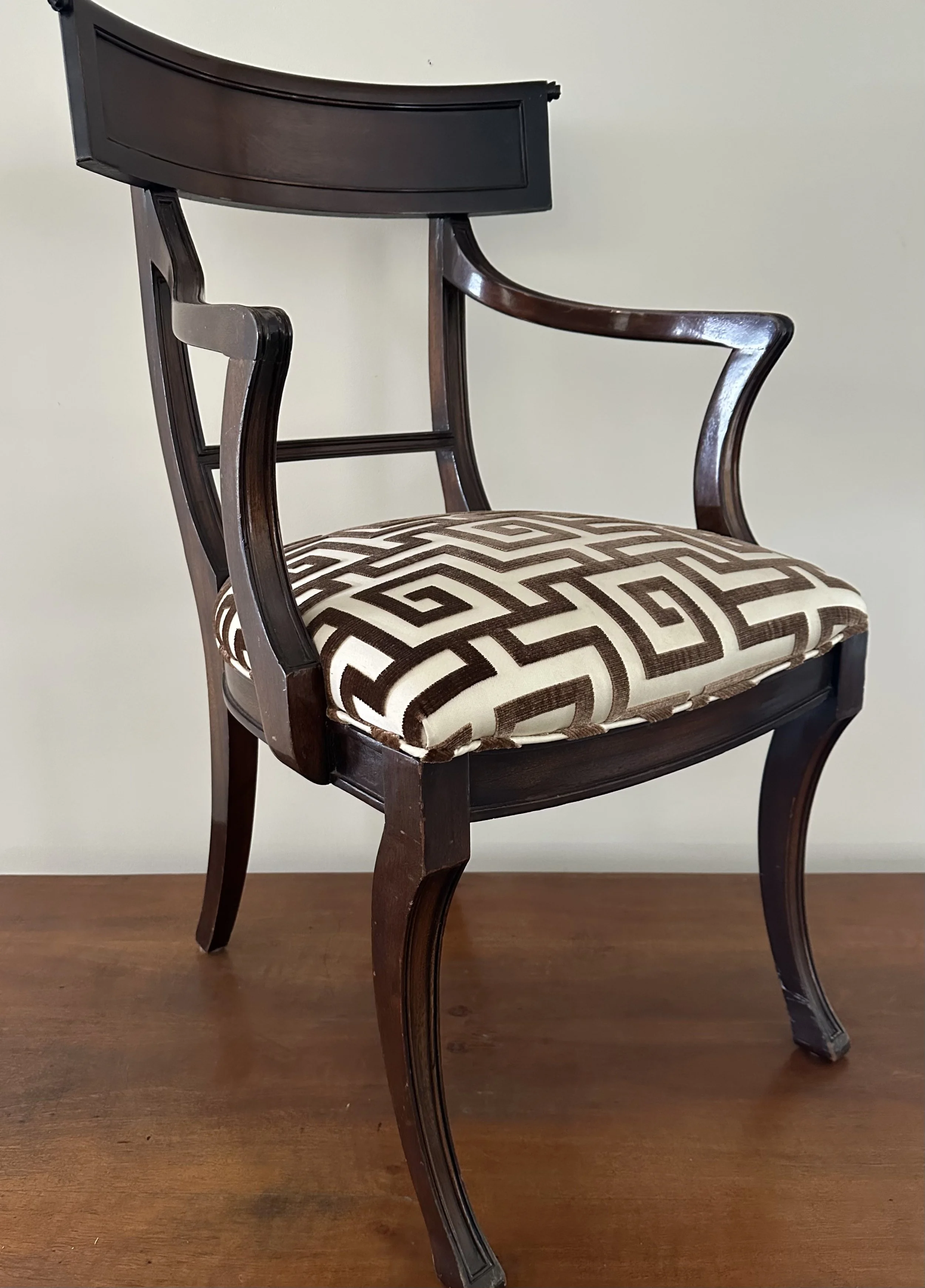 Neoclassical-style armchair with dark stained wood frame and elegant curved arms. The chair is upholstered in a chocolate brown and ivory velvet Greek key / labyrinth design.