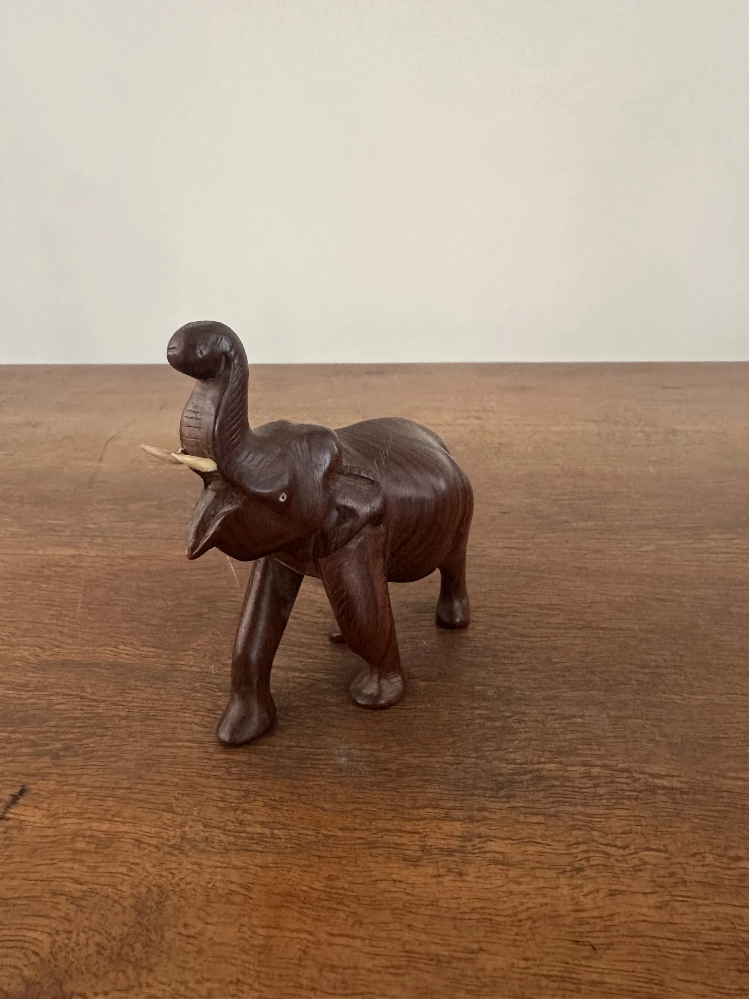 Set of two hand-carved wood elephants with tusk details. Each measures 4” tall