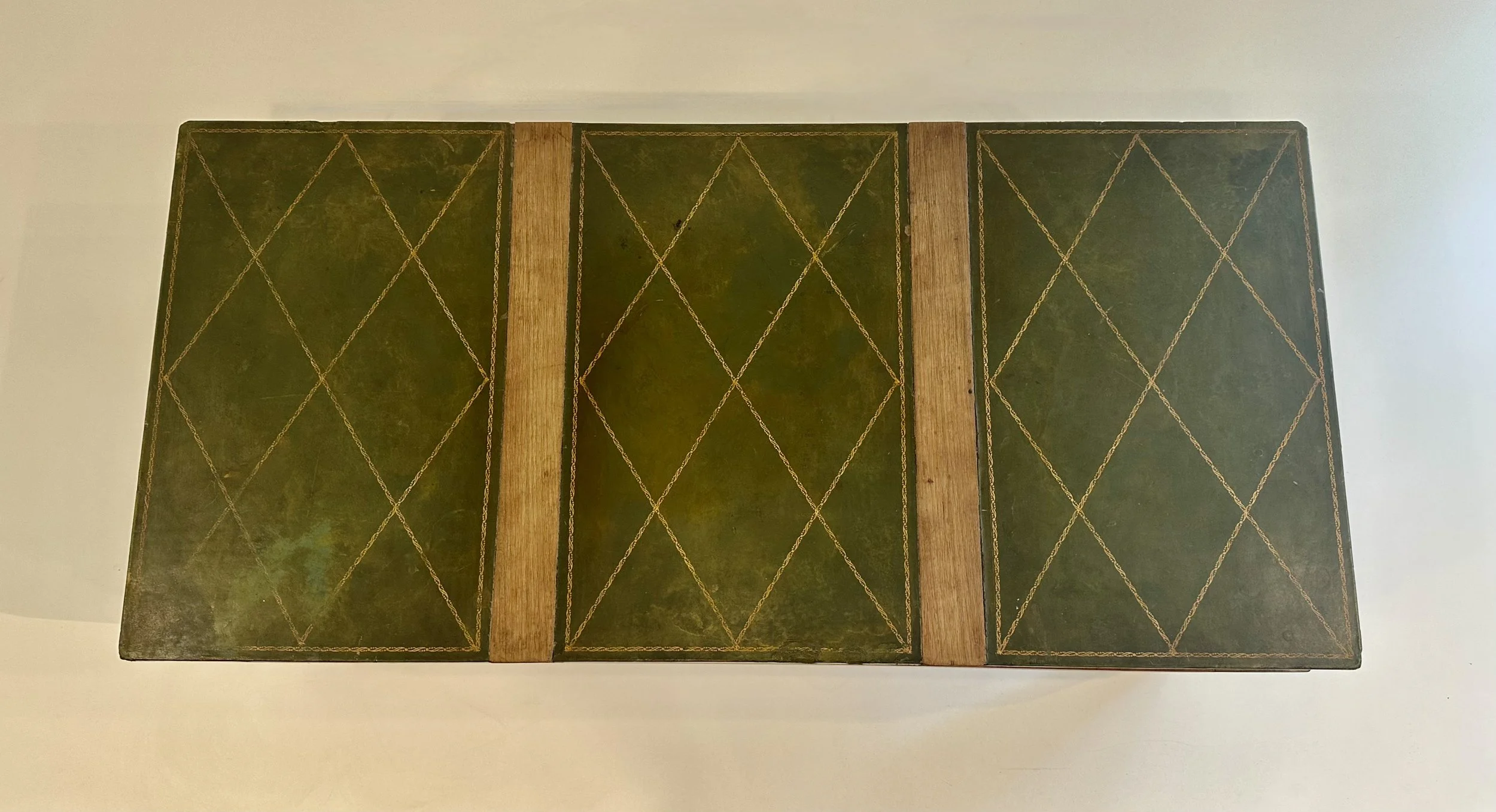 Vintage rectangular coffee table with inset green gilt-tooled leather panels framed by wood crossbands. Supported on a solid wood base with tapered leg